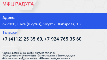 МФЦ РАДУГА по адресу 677000, Саха (Якутия), Якутск, Хабарова, 13 в дальнейшем Организация, размещена в следующих категориях: