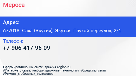 Мероса по адресу 677018, Саха (Якутия), Якутск, Глухой переулок, 2/1 в дальнейшем Организация, размещена в следующих категориях: