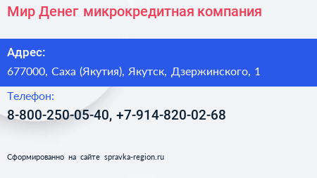 Мир Денег, микрокредитная компания по адресу 677000, Саха (Якутия), Якутск, Дзержинского, 1 в дальнейшем Организация, размещена в следующих категориях: