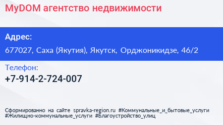 MyDOM, агентство недвижимости по адресу 677027, Саха (Якутия), Якутск, Орджоникидзе, 46/2 в дальнейшем Организация, размещена в следующих категориях: