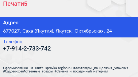 Печати5 по адресу 677027, Саха (Якутия), Якутск, Октябрьская, 24 в дальнейшем Организация, размещена в следующих категориях: