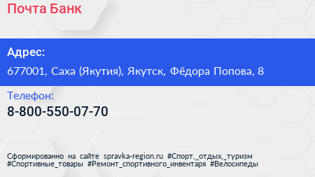 Почта Банк по адресу 677001, Саха (Якутия), Якутск, Фёдора Попова, 8 в дальнейшем Организация, размещена в следующих категориях: