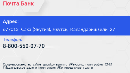 Почта Банк по адресу 677013, Саха (Якутия), Якутск, Каландаришвили, 27 в дальнейшем Организация, размещена в следующих категориях: