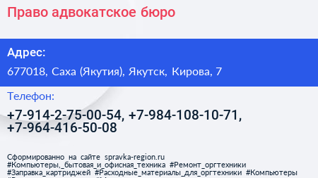 Право, адвокатское бюро по адресу 677018, Саха (Якутия), Якутск, Кирова, 7 в дальнейшем Организация, размещена в следующих категориях: