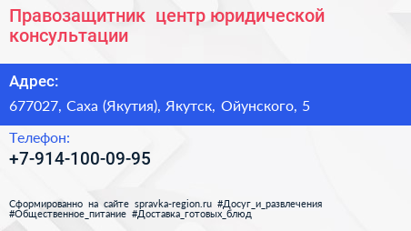 Правозащитник+, центр юридической консультации по адресу 677027, Саха (Якутия), Якутск, Ойунского, 5 в дальнейшем Организация, размещена в следующих категориях: