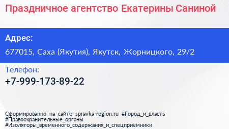 Праздничное агентство Екатерины Саниной по адресу 677015, Саха (Якутия), Якутск, Жорницкого, 29/2 в дальнейшем Организация, размещена в следующих категориях: