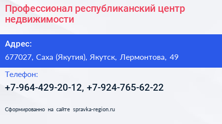 Профессионал, республиканский центр недвижимости по адресу 677027, Саха (Якутия), Якутск, Лермонтова, 49 в дальнейшем Организация, размещена в следующих категориях: