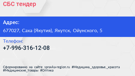 СБС-тендер по адресу 677027, Саха (Якутия), Якутск, Ойунского, 5 в дальнейшем Организация, размещена в следующих категориях: