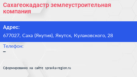 Сахагеокадастр, землеустроительная компания по адресу 677027, Саха (Якутия), Якутск, Кулаковского, 28 в дальнейшем Организация, размещена в следующих категориях: