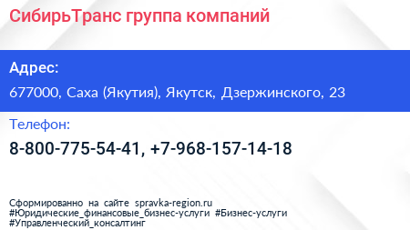 СибирьТранс, группа компаний по адресу 677000, Саха (Якутия), Якутск, Дзержинского, 23 в дальнейшем Организация, размещена в следующих категориях: