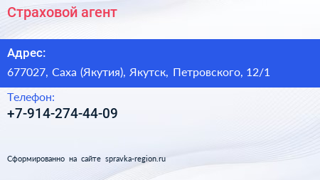 Страховой агент по адресу 677027, Саха (Якутия), Якутск, Петровского, 12/1 в дальнейшем Организация, размещена в следующих категориях: