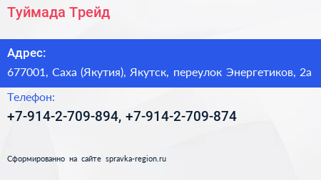 Туймада-Трейд по адресу 677001, Саха (Якутия), Якутск, переулок Энергетиков, 2а в дальнейшем Организация, размещена в следующих категориях: