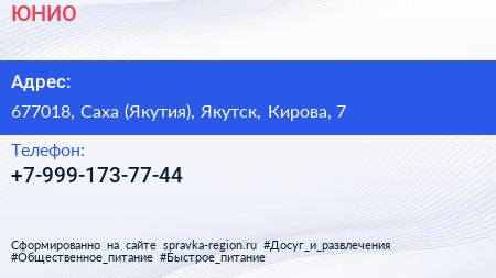ЮНИО по адресу 677018, Саха (Якутия), Якутск, Кирова, 7 в дальнейшем Организация, размещена в следующих категориях: