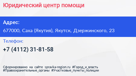 Юридический центр помощи по адресу 677000, Саха (Якутия), Якутск, Дзержинского, 23 в дальнейшем Организация, размещена в следующих категориях: