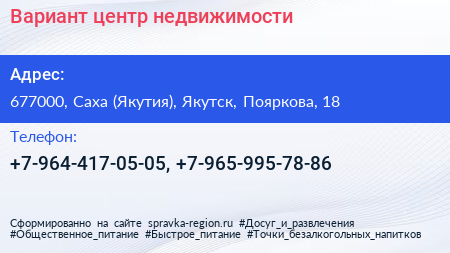 Вариант, центр недвижимости по адресу 677000, Саха (Якутия), Якутск, Пояркова, 18 в дальнейшем Организация, размещена в следующих категориях: