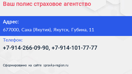 Ваш полис, страховое агентство по адресу 677000, Саха (Якутия), Якутск, Губина, 11 в дальнейшем Организация, размещена в следующих категориях: