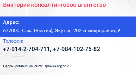 Виктория, консалтинговое агентство по адресу 677000, Саха (Якутия), Якутск, 202-й микрорайон, 9 в дальнейшем Организация, размещена в следующих категориях: