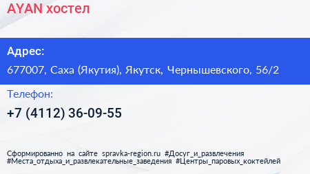 AYAN, хостел по адресу 677007, Саха (Якутия), Якутск, Чернышевского, 56/2 в дальнейшем Организация, размещена в следующих категориях: