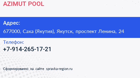 AZIMUT POOL по адресу 677000, Саха (Якутия), Якутск, проспект Ленина, 24 в дальнейшем Организация, размещена в следующих категориях: