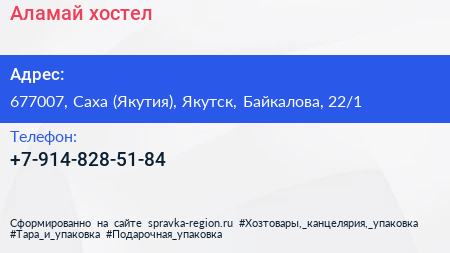 Аламай, хостел по адресу 677007, Саха (Якутия), Якутск, Байкалова, 22/1 в дальнейшем Организация, размещена в следующих категориях: