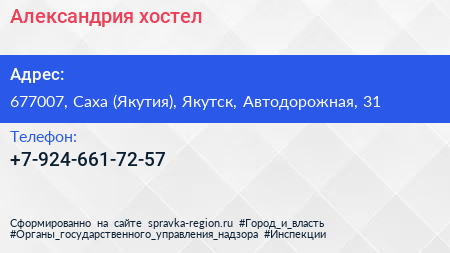 Александрия, хостел по адресу 677007, Саха (Якутия), Якутск, Автодорожная, 31 в дальнейшем Организация, размещена в следующих категориях: