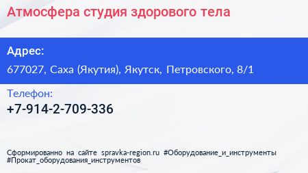 Атмосфера, студия здорового тела по адресу 677027, Саха (Якутия), Якутск, Петровского, 8/1 в дальнейшем Организация, размещена в следующих категориях: