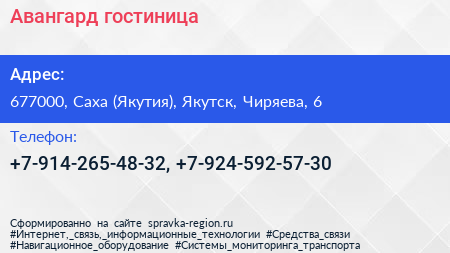 Авангард, гостиница по адресу 677000, Саха (Якутия), Якутск, Чиряева, 6 в дальнейшем Организация, размещена в следующих категориях: