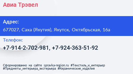 Авиа-Трэвел по адресу 677027, Саха (Якутия), Якутск, Октябрьская, 16а в дальнейшем Организация, размещена в следующих категориях: