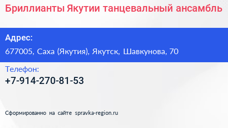 Бриллианты Якутии, танцевальный ансамбль по адресу 677005, Саха (Якутия), Якутск, Шавкунова, 70 в дальнейшем Организация, размещена в следующих категориях: