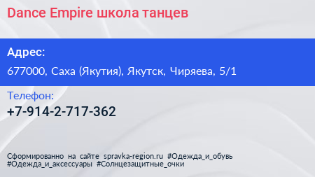 Dance Empire, школа танцев по адресу 677000, Саха (Якутия), Якутск, Чиряева, 5/1 в дальнейшем Организация, размещена в следующих категориях: