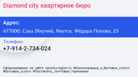 Diamond city, квартирное бюро по адресу 677000, Саха (Якутия), Якутск, Фёдора Попова, 23 в дальнейшем Организация, размещена в следующих категориях:
