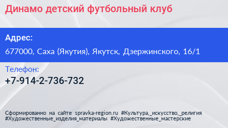 Динамо, детский футбольный клуб по адресу 677000, Саха (Якутия), Якутск, Дзержинского, 16/1 в дальнейшем Организация, размещена в следующих категориях: