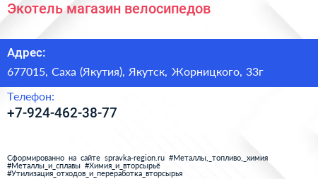 Экотель, магазин велосипедов по адресу 677015, Саха (Якутия), Якутск, Жорницкого, 33г в дальнейшем Организация, размещена в следующих категориях: