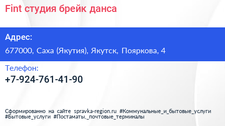 Fint, студия брейк-данса по адресу 677000, Саха (Якутия), Якутск, Пояркова, 4 в дальнейшем Организация, размещена в следующих категориях:
