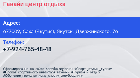 Гавайи, центр отдыха по адресу 677009, Саха (Якутия), Якутск, Дзержинского, 76 в дальнейшем Организация, размещена в следующих категориях: