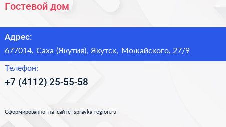 Гостевой дом по адресу 677014, Саха (Якутия), Якутск, Можайского, 27/9 в дальнейшем Организация, размещена в следующих категориях: