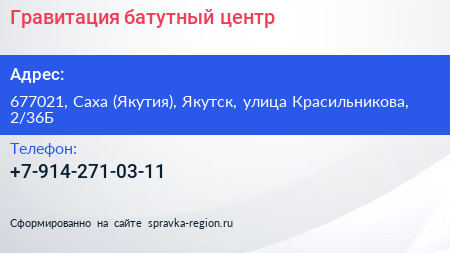 Гравитация, батутный центр по адресу 677021, Саха (Якутия), Якутск, улица Красильникова, 2/36Б в дальнейшем Организация, размещена в следующих категориях: