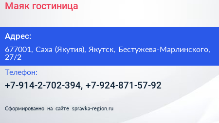 Маяк, гостиница по адресу 677001, Саха (Якутия), Якутск, Бестужева-Марлинского, 27/2 в дальнейшем Организация, размещена в следующих категориях: