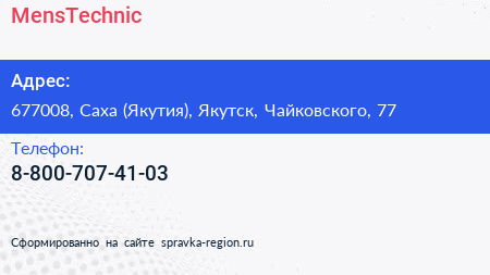 MensTechnic по адресу 677008, Саха (Якутия), Якутск, Чайковского, 77 в дальнейшем Организация, размещена в следующих категориях: