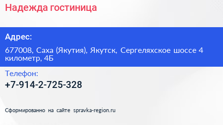 Надежда, гостиница по адресу 677008, Саха (Якутия), Якутск, Сергеляхское шоссе 4 километр, 4Б в дальнейшем Организация, размещена в следующих категориях: