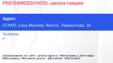 PRO. DANCESCHOOL, школа танцев по адресу 677005, Саха (Якутия), Якутск, Лермонтова, 36 в дальнейшем Организация, размещена в следующих категориях: