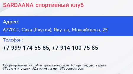 SARDAANA, спортивный клуб по адресу 677014, Саха (Якутия), Якутск, Можайского, 25 в дальнейшем Организация, размещена в следующих категориях: