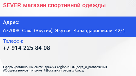 SEVER, магазин спортивной одежды по адресу 677008, Саха (Якутия), Якутск, Каландаришвили, 42/1 в дальнейшем Организация, размещена в следующих категориях: