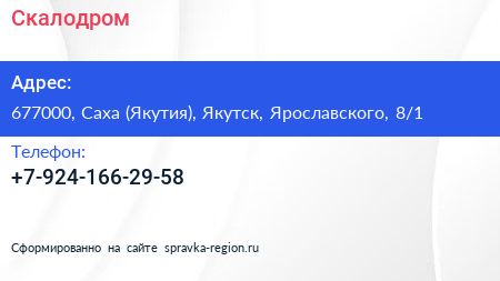 Скалодром по адресу 677000, Саха (Якутия), Якутск, Ярославского, 8/1 в дальнейшем Организация, размещена в следующих категориях: