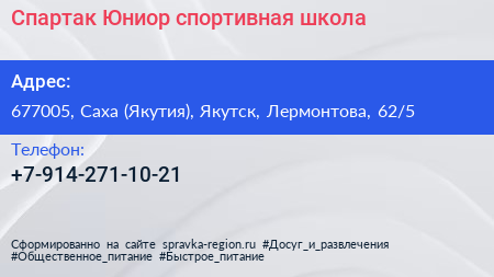 Спартак Юниор, спортивная школа по адресу 677005, Саха (Якутия), Якутск, Лермонтова, 62/5 в дальнейшем Организация, размещена в следующих категориях: