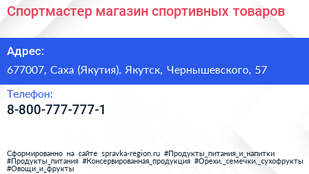 Спортмастер, магазин спортивных товаров по адресу 677007, Саха (Якутия), Якутск, Чернышевского, 57 в дальнейшем Организация, размещена в следующих категориях: