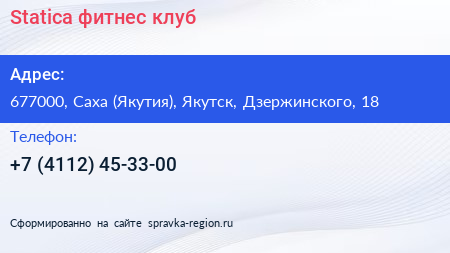 Statica, фитнес-клуб по адресу 677000, Саха (Якутия), Якутск, Дзержинского, 18 в дальнейшем Организация, размещена в следующих категориях: