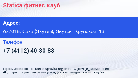 Statica, фитнес-клуб по адресу 677018, Саха (Якутия), Якутск, Крупской, 13 в дальнейшем Организация, размещена в следующих категориях: