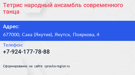 Тетрис, народный ансамбль современного танца по адресу 677000, Саха (Якутия), Якутск, Пояркова, 4 в дальнейшем Организация, размещена в следующих категориях: