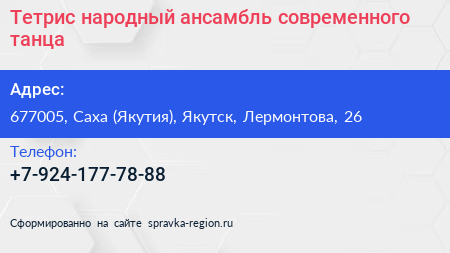 Тетрис, народный ансамбль современного танца по адресу 677005, Саха (Якутия), Якутск, Лермонтова, 26 в дальнейшем Организация, размещена в следующих категориях: